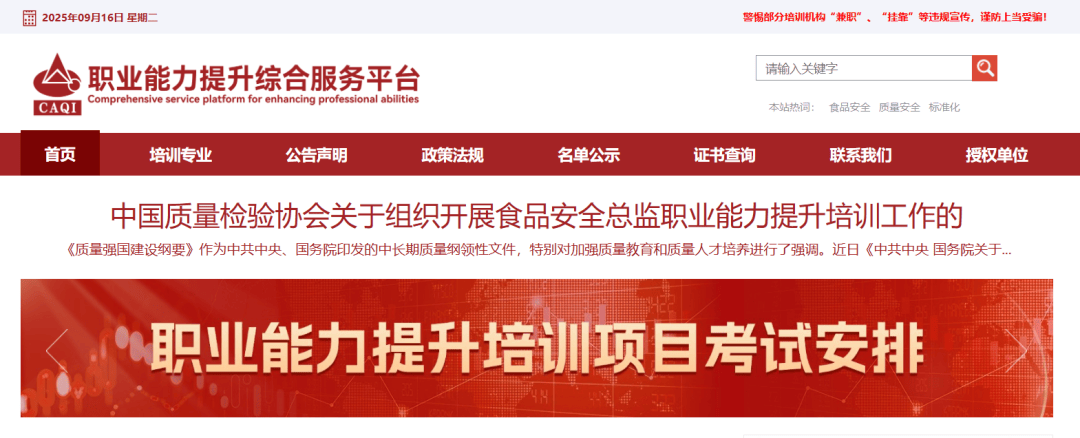 食物出产、加工企业中的高级办理人员和食物平安工做次要担任人,餐饮企业的高级办理人员和食物平安工做次要担任人,企事业单元中食物平安工做次要担任人和分担带领,畅通范畴相关企业的食物平安工做次要担任人,相关从管部分的食物平安监管人员,有志于处置食物平安办理工做的相关专业手艺人员等。培训完成报名且获得授权的进修账号后,可按照本身需要随时登录上述线上培训办事平台进行正在线年第四时度起头,拟正在每个季度的最初一个周六或周日进行培训测验(具体放置以本协会网坐发布通知为准);培训完成对应课程所需需要学时的进修后,按照相关要乞降相关登录上述线上培训办事平台正在时间内进行同一测验。第一步:正在旅逛器输入进入 中国质量查验协会官网,第二步:官网页面下滑点击“职业 能力提拔培训栏目” ,进 入职业能力提拔分析办事平台。第三步:进入《职业能力提拔分析 办事平台》点击进修中 心,进入登录页面输入账 号及暗码,点击登录。工做者,相关科研院所、大专院校、学术机构、企事业单元及质量工做取得显著成效的企业取企业担任人,取质量查验相关工做的社会相关人士等志愿结成的、行业性、非营利性社会组织,具有法人资历。中国质量查验协会筹备于1986年,并于1992年正式成立,登记办理机关为平易近政部,行业次要办理部分为国度市场监视办理总局(简称国度市场监管总局),外行业次要办理部分的对口司局为国度市场监管总局质量成长局(牵头对口司局)、国度市场监管总局承认检测司。国度市场监管总局2018年4月组建成立之前,中国质量查验协会历任营业从管部分为原国度质量监视查验检疫总局(简称原国度质检总局)、原国度质量手艺监视局、原国度手艺监视局、原国度经济委员会质量局。