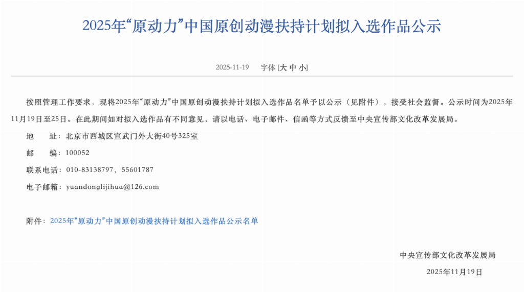 近日,地方宣传部文化成长局通过国度旧事出书署官网发布《2025年“原动力”中国原创动漫搀扶打算拟入选做品公示》“原动力&。。。