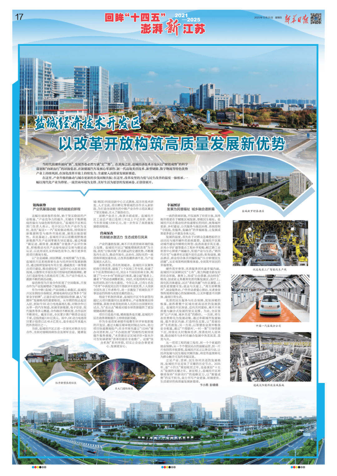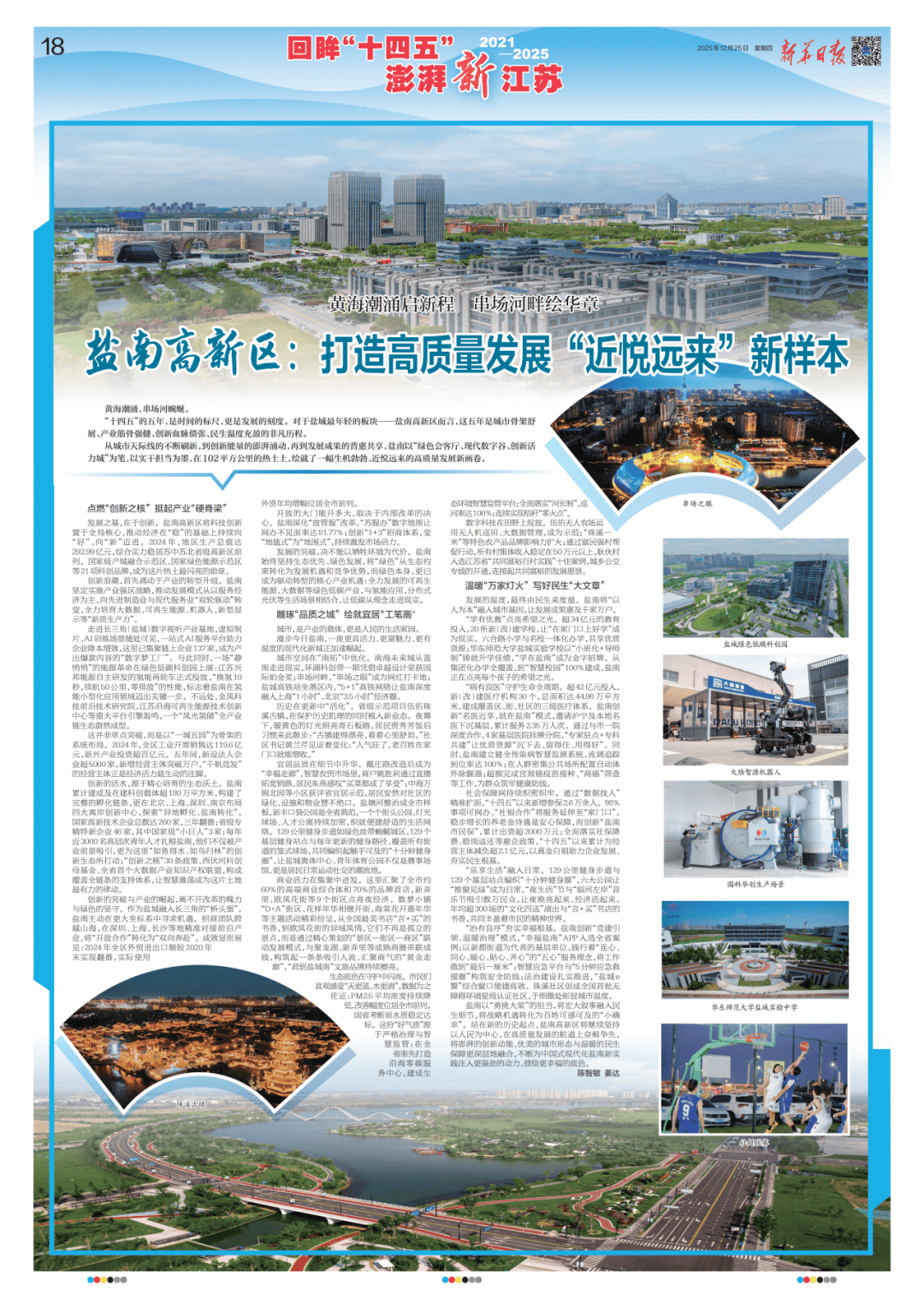 “十四五”的五年,是时间的标尺,更是成长的刻度。对于盐城最年轻的板块——盐南高新区而言,这五年是城市骨架舒展、财产筋骨健旺、立异血脉偾张、平易近生温度充盈的不凡过程。(12月25日,新华日报18版)