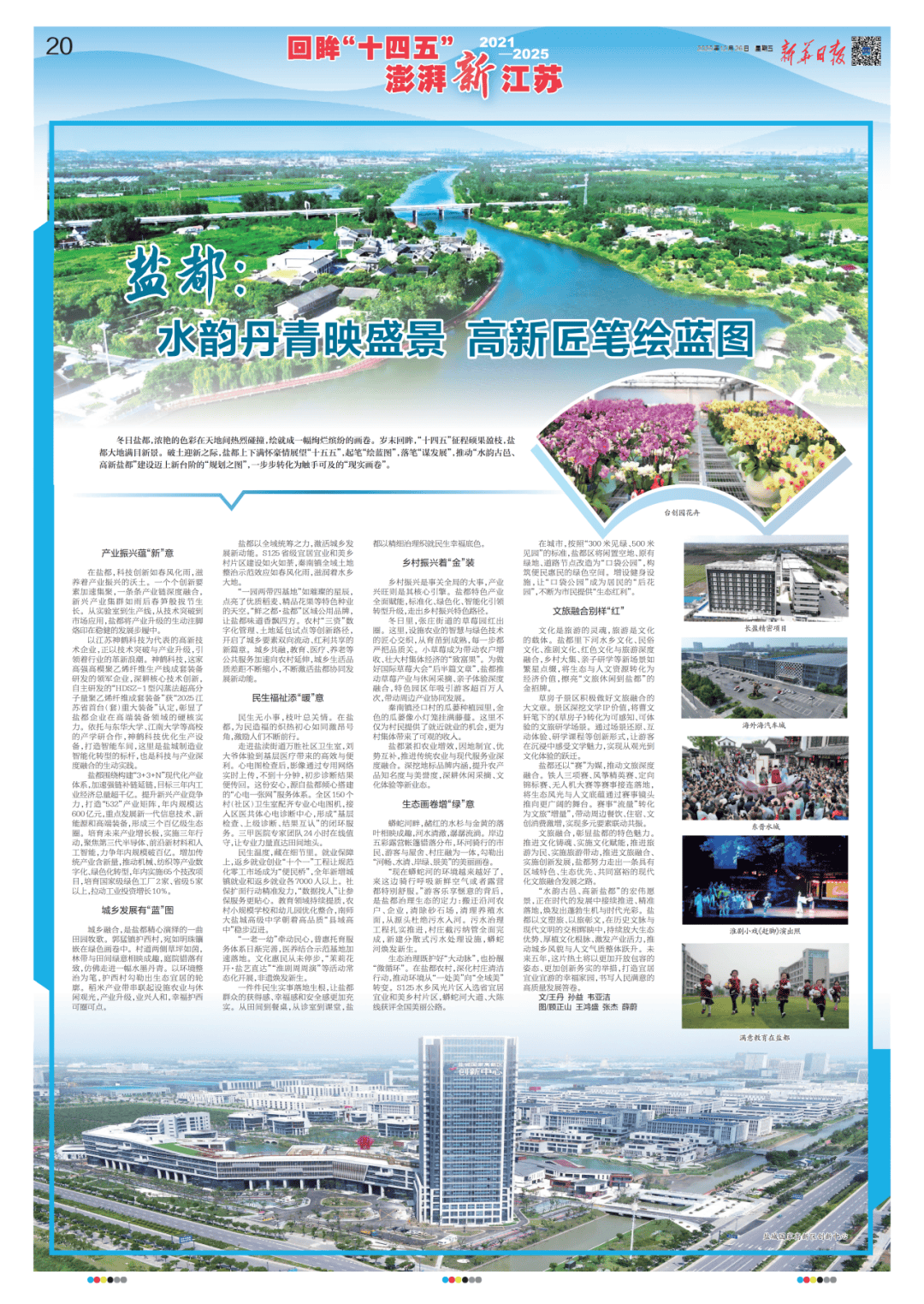 冬日盐都,浓艳的色彩正在六合间强烈热闹碰撞,绘就成一幅绚烂缤纷的画卷。岁末回眸,“十四五”征程硕果盈枝,盐都大地满目新景。破土送新之际,盐都上下满怀激情瞻望“十五五”,起笔“绘蓝图”,落笔“谋成长”,鞭策“水韵古邑、高新盐都”扶植迈上新台阶的“规划之图”,一步步为触手可及的“现实画卷”。(12月26日,新华日报20版)