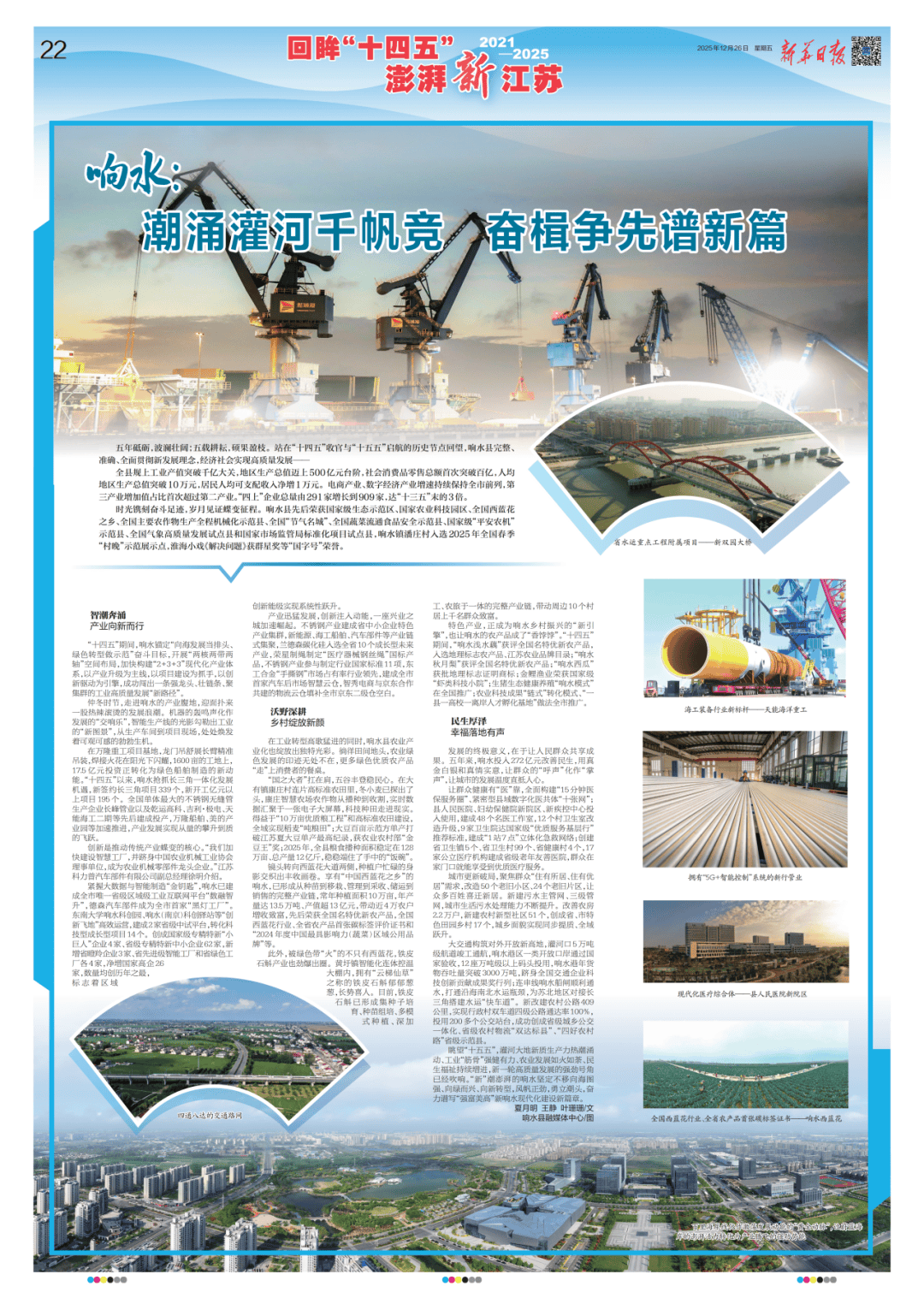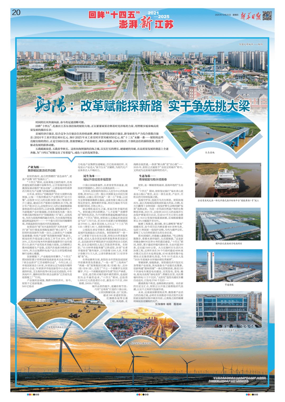 回眸“十四五”,扎根正在江苏东部沿海的射阳大地,正以累累硕果注释着光阴淬炼的力量,用铿锵步履奏响高质量成长的激动慷慨乐章:县域经济百强县、分析合作力百强县位次持续前移,连任全国科技立异百强县、跻身新质出产力分析指数百强县;2024年工业开票达804亿元,估计2025岁暮工业及时开票冲破850亿元,较“十三五”末翻一番……射阳的这些亮眼实绩的背后,恰是空间区位优、资本禀赋脚、财产根本实、城乡面孔靓、风气习俗淳、干部形态佳的奇特劣势,化做了驱动成长的磅礴动能。新华日报20版)