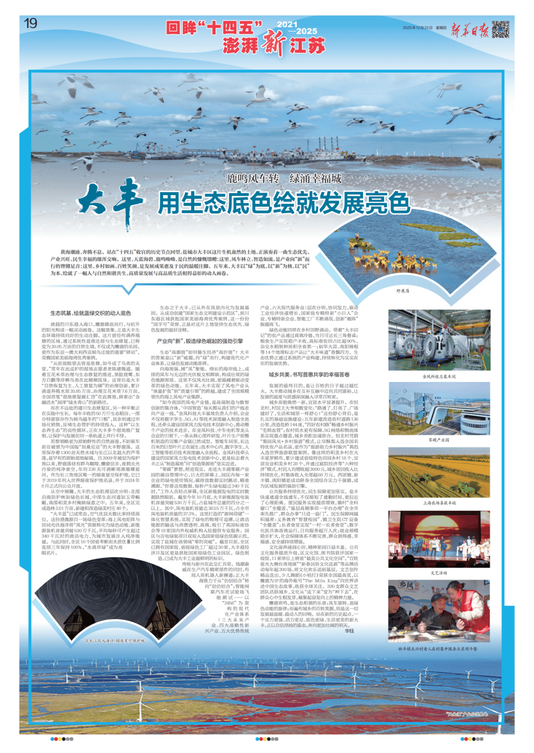 黄浪潮涌,飞跃不息。坐正在“十四五”收官的汗青节点回望,盐城市大丰区这片朝气盎然的地盘,正吹奏着一曲生态优先、财产畅旺、平易近生幸福的雄浑交响。这里,天蓝海碧、鹿鸣呦呦,是天然的捐赠;这里,风车林立、智制如流,是财产向“新”而行的铿锵脚音;这里,村落如画、苍生笑容,是成长惠及于平易近的温暖注脚。(12月25日,新华日报19版)